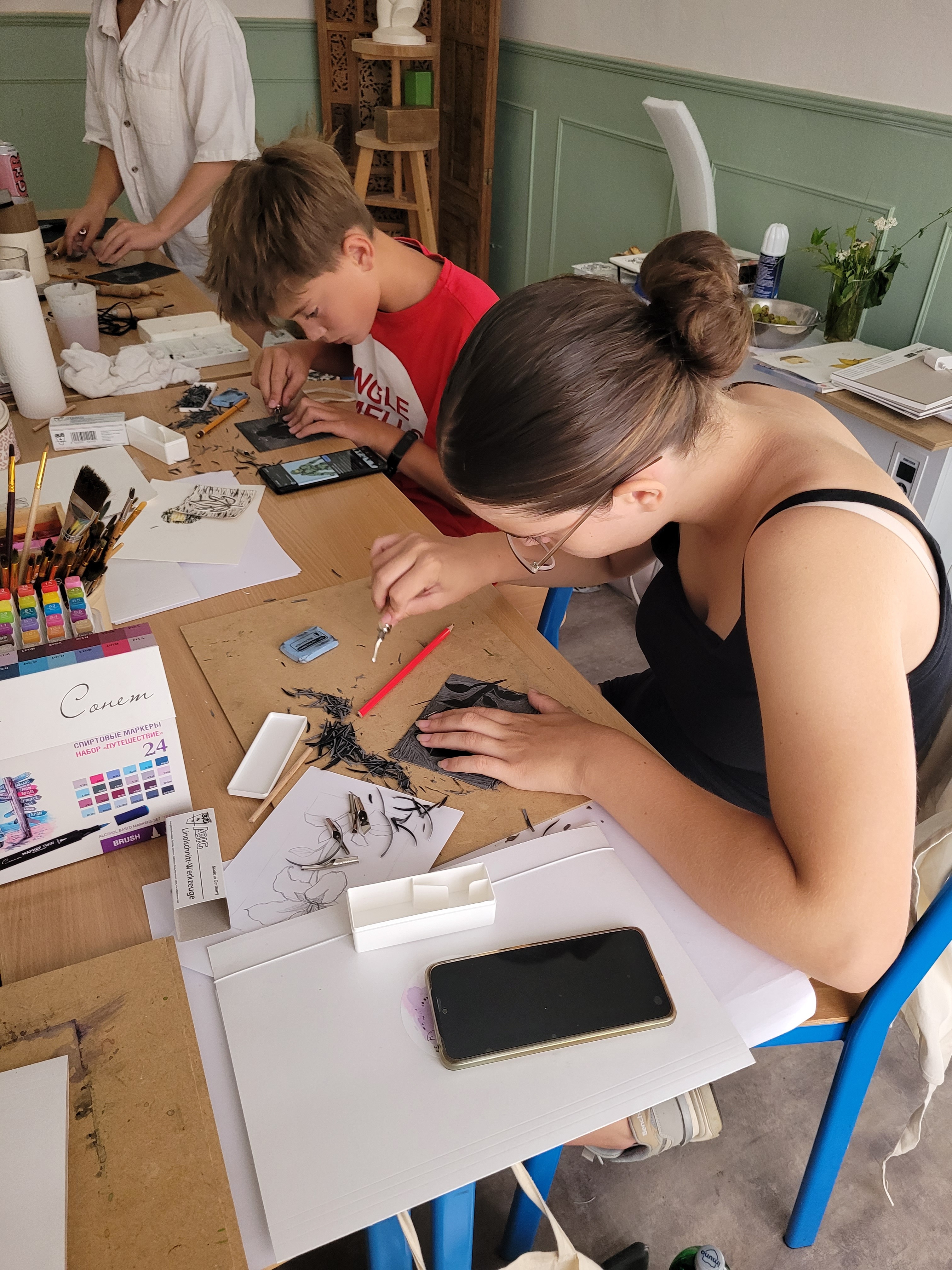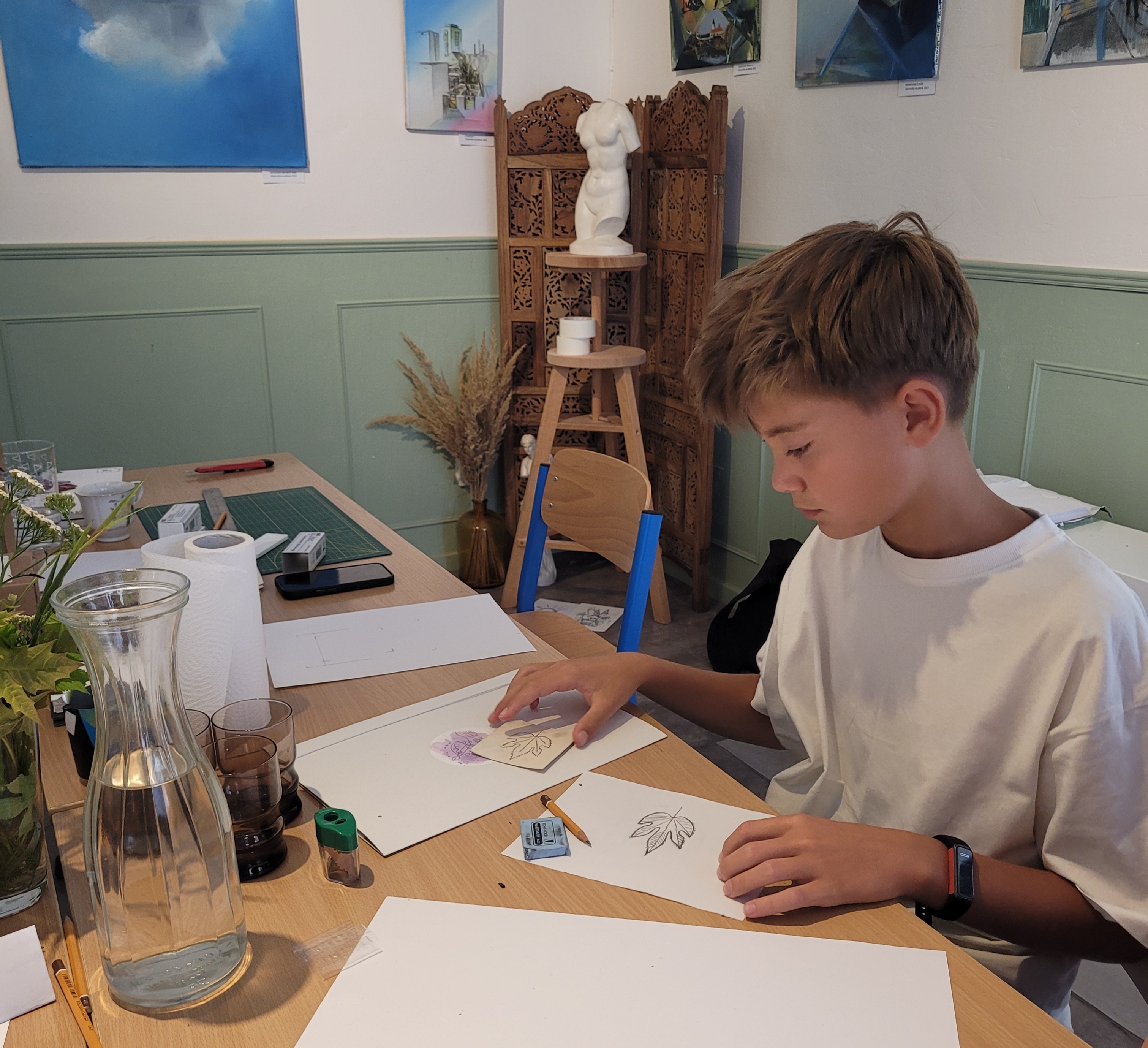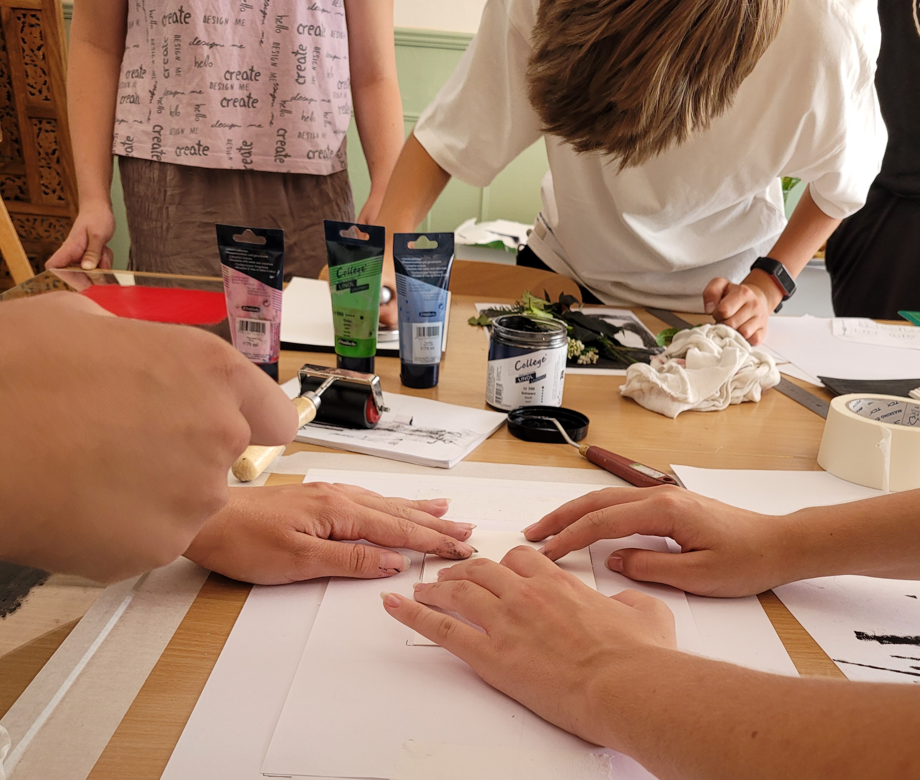 Ve dnech 11.-15. srpna 2025 u nás v ateliéru pod vedením odborných lektorů proběhla Výtvarná letní škola. Naši studenti se v průběhu konání akce seznámili se základy linorytu a dalších grafických technik, nechybělo také studium perspektivy v terénu a další malířské a kreslířské techniky.